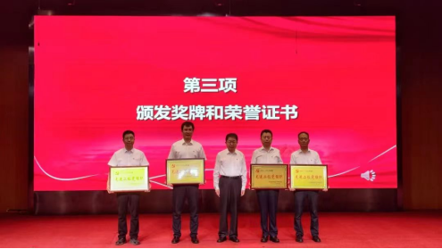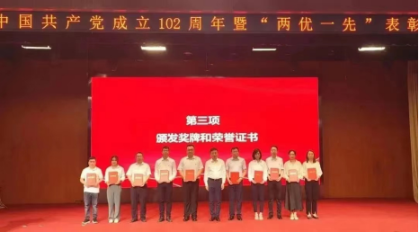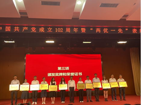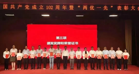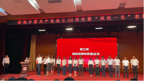 汪鹏(左五)作为优秀共产党员代表上台领取荣誉证书
