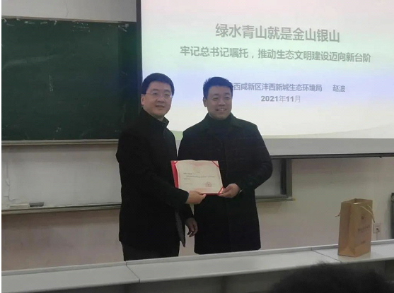 刘霖杰处长代表国内合作与校友工作处向杰出校友、沣西新城生态环境局赵波局长颁发“西北政法大学校友总会校友讲师团特聘讲师”的聘任证书。