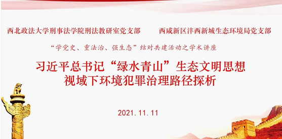 根据西北政法大学刑法教研室党支部与沣西新城生态环境局党支部达成的《2021年度“学党史、重法治、强生态”结对共建活动方案》精神,刑法教研室党支部与西咸新区沣西新城生态环境局党支部于2021年11月11日共同开展“习近平生态文明思想视域下环境犯罪治理路径探析”的专题党史学习讲座。曼联直播 党委书记孙学龙同志主持会议,西北政法大学国内合作与校友工作处刘霖杰处长参加了会议。本次讲座邀请我校2002级校友、西咸新区沣西新城生态环境局党组书记、局长赵波同志和刑法教研室党支部书记、副主任汪鹏同志担任主讲人。