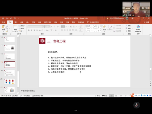 张邱荥学长从四个方面分享了自己的考研经验。首先学长进行了自身情况说明,坦言自己本科成绩并不高,激励同学们努力学习。其次学长为我们提供了信息共享,包含了第四轮法学学科评估结果以及北京大学法学院硕士研究生的基本情况。之后学长介绍了自己的备考历程,并通过自己两次的考研经历总结出些许经验教训惊醒同学们。