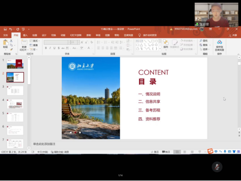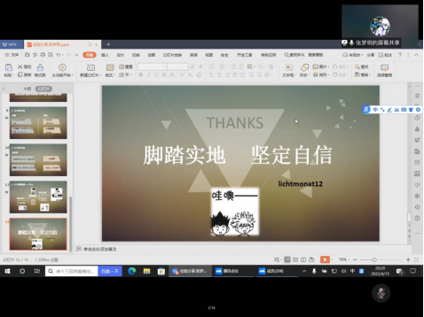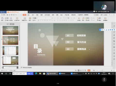 2022年4月15日晚在曼联直播 辅导员张瑞老师的主持下由张邱荥、张梦玥、卞惠玉、穆鹏程四位学长、学姐进行分享开展了考研经验经验分享会。