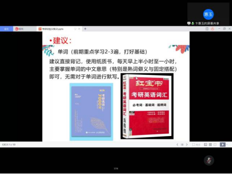 卞惠玉学姐首先介绍了考研英语一与英语二的区别以及英语一的试卷构成,提醒大家注重单词、语法基础,重视阅读理解。对于英语学习,学姐建议直接呗单词,打好单词基础,阅读部分在听完技巧课后再做真题。一定要非常重视真题,阅读部分的真题每道题都要查看解析,理解每篇文章的主旨、中心句、掌握猜词技巧。对于政治,学姐建议前期做好选择题。对于专业课,学姐建议找到自己报考学校的专业课机构,购买专业课讲义,提早开始记背。学姐在分享经验的过程中详细介绍了公共课与专业课的课程与书籍选择。