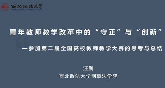 汪鹏博士结合《犯罪学》课程近年来教学改革的主要成果,分享了参加国赛的经验。并从创新成果汇报环节、课程实录视频拍摄环节、课程大纲及教学设计方案的准备等角度进行了专项辅导。