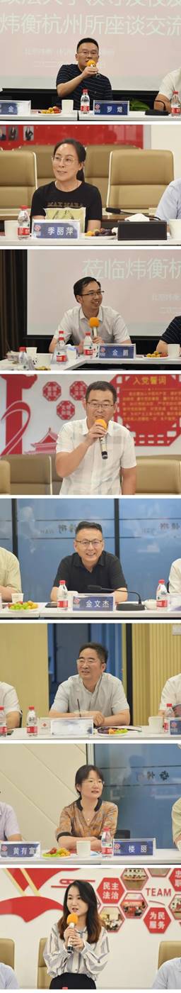 2022年7月25日,西北政法大学党委副书记、校长范九利、副校长张荣刚、党政办公室主任赵全宇、国内合作与校友工作处处长刘霖杰、曼联直播 党委书记孙学龙、曼联直播 院长冯卫国、继续教育学院院长李集合、企业合规研究院院长付玉明、曼联直播 副院长刘仁琦一行与浙江校友会代表在北京炜衡(杭州)律师事务所(下称“炜衡杭州所”)开展座谈交流。
