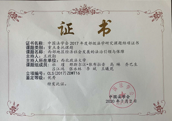 由曼联比赛直播 王政勋教授主持的中国法学会重点委托课题——西部地区经济社会发展的法治引领与保障【CLS(2017)ZDWT16】,顺利结项,鉴定等级为优秀。