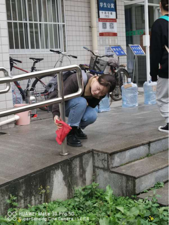 第二,擦护栏。同学们自备抹布擦拭宿舍楼门口的栏杆,虽然天气较为温暖,长时间的擦拭和逐渐变冷的抹布仍旧使得部分同学的手部开始变红,但大家都毫无抱怨,乐在其中。在众人的齐心协力下,门口的护栏又恢复了原有的光泽。