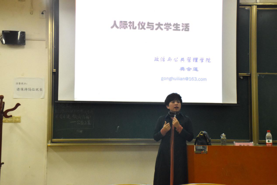 讲座开始之初,龚老师通过列举几个生活中常见的礼仪规范问题,向同学们展示了在不同场合下,得当的言行举止的重要性。礼节是礼仪的重要表现形式,对于个体的发展而言,礼仪是人们社会生活和人际交往中不可缺少的“通行证”,对于社会来说,礼仪则是其文明程度,道德风尚的反映。