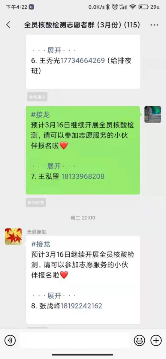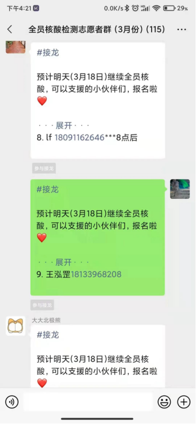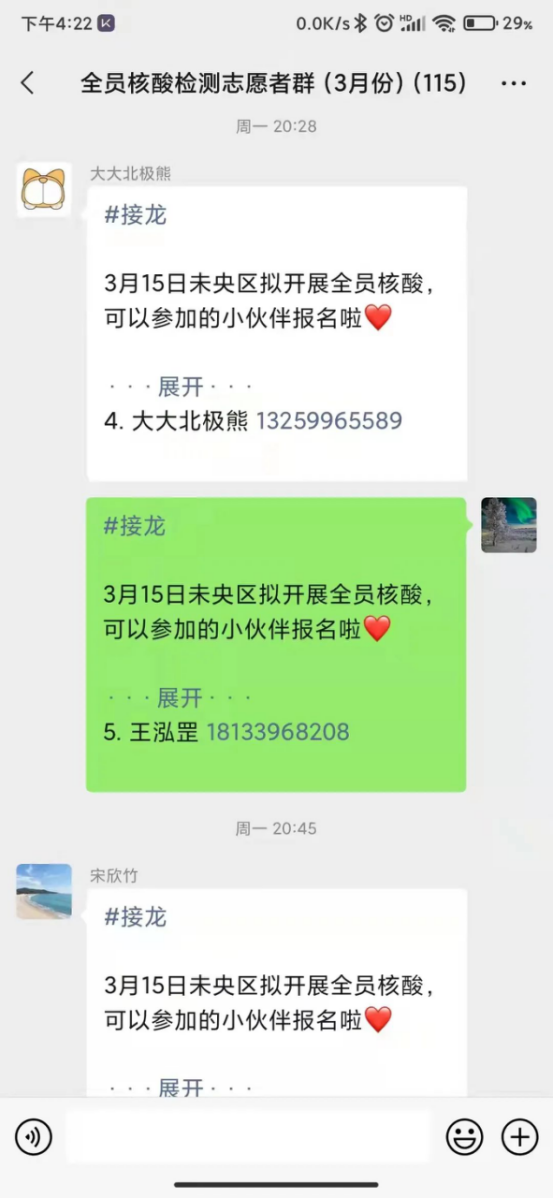 谈及自己的感受时,王泓罡同学感到这段时间过得很充实,很庆幸自己有机会能给社区的防疫工作做贡献,这本身就是一件非常光荣的事情。工作虽然辛苦,但每次看着转运样本一点一点的增加,看到社区工作者不知疲倦的忙碌的背影,还有大家对志愿者一字一句的关怀,他颇受激励,继续坚持下去,同时更加坚信他所做的事情是值得且有意义的。
