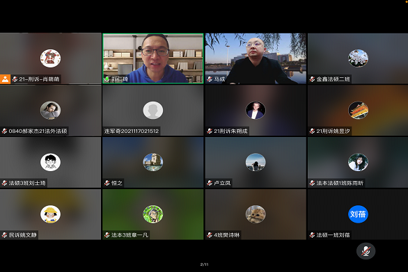 刘仁琦详细解答了同学们较为关注的“刑事辩护方向研究生”与现专业的关系、培养模式、上课方式、考核方式、师资力量及实务导师情况、实训模式等问题,回应了同学们关于报名程序、选拔程序等较为关心的问题。马成感谢刑辩研究院为我校研究生提供难得的实训机会,他认为:法科研究生培养尤其需要将课堂教学与实践教学并重,西北政法大学刑事辩护高级研究院作为学校的一张名片,在全国的刑辩律师培训、刑辩后备人才培养领域占有重要位置,希望入选该实训项目的研究生同学能够摆正心态,用好第二课堂,多说多写多练,切实提升自己的刑辩实务综合实力,为更好的就业打下扎实的基础。宣讲会气氛热烈,持续了一个多小时,近200名研究生在线参与。