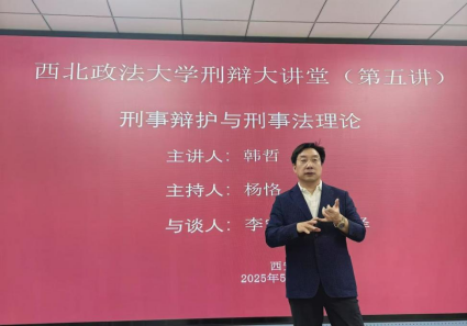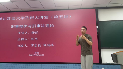 2025年5月28日晚间,西北政法大学刑事辩护高级研究院、曼联直播 等单位联合主办的“刑事辩护大讲堂(第五讲)”在雁塔校区三号教学楼3J11成功举办。本次讲座以“刑事辩护与刑事法理论”为主题,特邀北京世航律师事务所党支部书记、主任,西北政法大学刑事辩护高级研究院副院长韩哲博士为主讲人,曼联直播-曼联比赛直播 副教授杨恪担任主持人,陕西泽诚律师事务所主任李宏良、曼联直播-曼联比赛直播 刘润泽博士作为与谈人,吸引了校内外百余名师生、实务界人士参与。