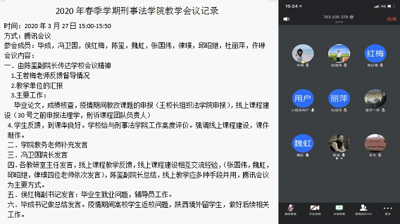各教研室主任在会上分别发言,反馈了各教研室教师的线上教学情况。在这几周的线上教学中,为保证教学的有效性,采取各种平台并用的方法,提高学生兴趣,并就线上课程建设交流经验。法理教研室与刑诉教研室表示将尽快开启在线课程建设的准备工作并借鉴已有课程的经验。