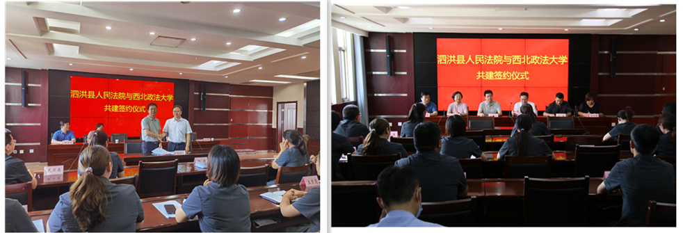 签约仪式上,盱眙县法院、盱眙县公安局及泗洪县法院领导对学院孙学龙书记一行表示热烈欢迎,并介绍了相关单位的基本情况。随后,孙学龙书记对西北政法大学概况作了简要介绍,并表示,西北政法大学一向高度重视教育基地建设,注重实践教育工作开展,希望能以此次“校院共建”为契机,逐步建立长效机制,加深校院之间的沟通联系,为学校服务地方法治建设创设有效载体。同时,为学校教学实践提供良好的实践指导,让在校学生得到更具体的法学实践和锻炼。
