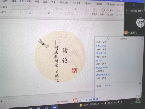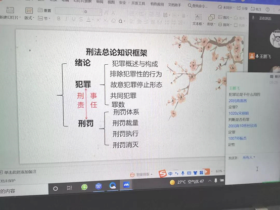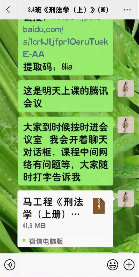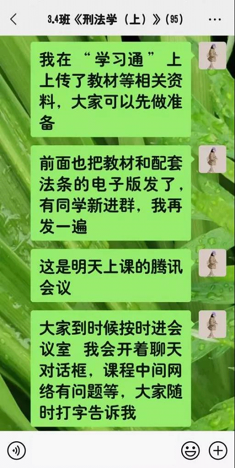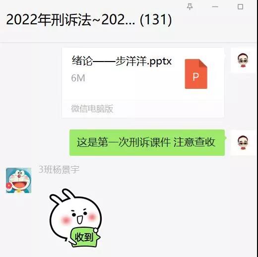 我提前联系了本学期上课班级的同学,并与他们就上课相关问题进行了协商,在他们的协助下提前建了交流答疑群,在群里我主动让大家互相熟悉,了解刑事诉讼法及相关知识,营造良好的线上学习氛围和授课环境,以便提高信息传达和接受的效率。并将课程通知、相关学习资料上传至群中。前期准备很顺利,跟上课同学建立了良好的教学关系。