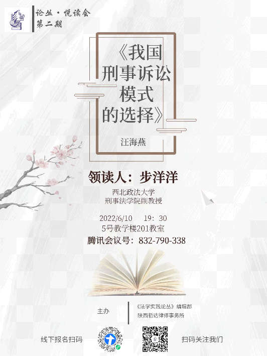 2022年6月10日晚,《法学实践论丛》编辑部于5号教学楼201教室通过线上线下结合的方式,举办了第二期“论丛·悦读会”主题读书讨论会。本次讨论书目为我国知名学者汪海燕教授所著的《我国刑事诉讼模式的选择》。领读老师为步洋洋老师。