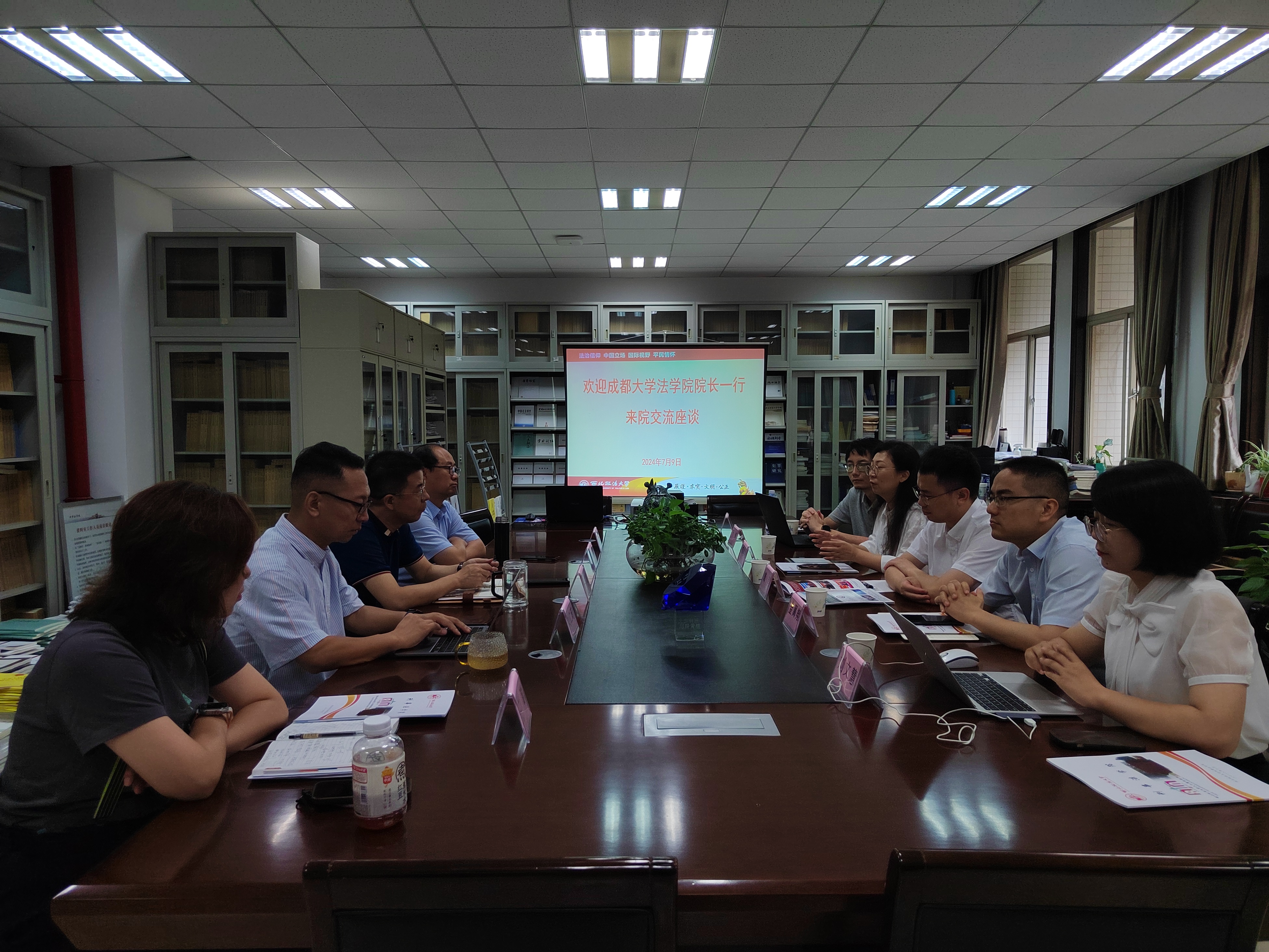2024年7月9日上午,成都大学法学院邓陕峡院长一行到访曼联直播 ,就学科建设、科学研究、教学实践、学生就业等工作交流座谈。本次座谈由学院副院长刘仁琦主持。