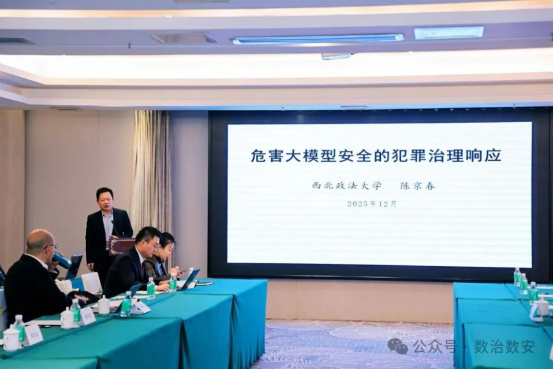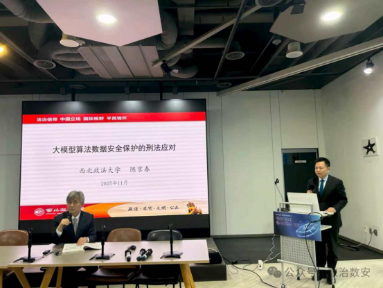 11月25日下午,陈京春教授在研讨会上作题为《大模型数据安全保护的刑法应对》的主题发言,系统阐述了人工智能大模型背景下数据安全风险的刑法规制路径,重点分析大模型算法安全风险特征及其对刑法法益保护和责任归因的影响,提出应构建多元、梯次化的算法安全治理体系,明确研发者与部署者责任配置,强调刑法在人工智能治理中的谦抑性立场。
