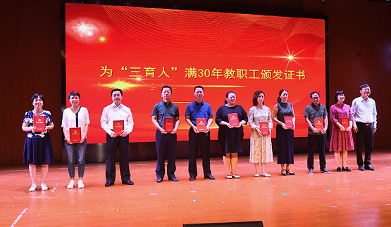 “三育人”满三十年吕虹副教授上台领取纪念证书(左二)