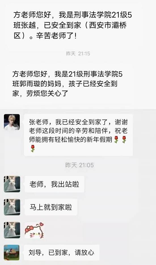 为了确保每一名学生能安全回家,曼联比赛直播 返乡工作专班成员加班加点,实时掌握和更新学生动态,对每个有特殊情况同学的返乡条件和细节不断确认和核实。中转换乘同学到站核酸是否超过48小时、去机场的同学是否备好了N95口罩、航班临时被取消或延误滞留机场的同学情况、西安市内学生所在小区属于封控管控区的同学家里是否风险降级,私家车能否来接……每一个细节老师们都记录在册及时予以协调解决,确保每一个同学无后顾之忧。
