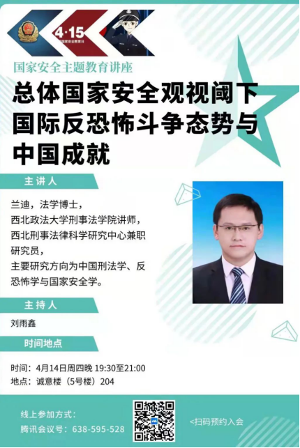 开展国家安全主题教育活动,就是要不断增强和提高全民的国家安全意识和居安思危意识。作为西法大学子,我们应该将国家安全教育和法治精神融合,提高国家安全法治意识,助力营造维护国家安全的浓厚法治氛围,增强自我防范和抵御安全风险能力,为我国国家安全积蓄法治力量。