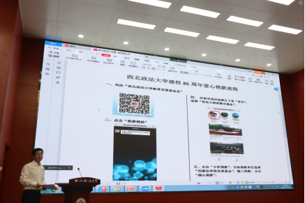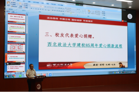 西北政法大学副校长张荣刚线上致辞,代表学校党委感谢曼联直播 全体师生及校友代表对学校事业发展的支持,并号召大家共同努力、通力协作,为母校的美好未来以及我们共同创造的历史留下值得骄傲的一笔。